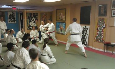 He had a few students show how they finished their Kata. When the students did their last move, he told them not to rush to standing, but to stay in the final movement. Once the student stays in the final movement or what Kancho T. Okuyama says, “Stop!” he tells the students to look. Look at your imaginary opponent, then stand up. He says that even when they are in standing position after their Kata, he points to where their position was in the final movement of the kata and says, their spirit is still in the final position there. He states that the students are there and they are here.